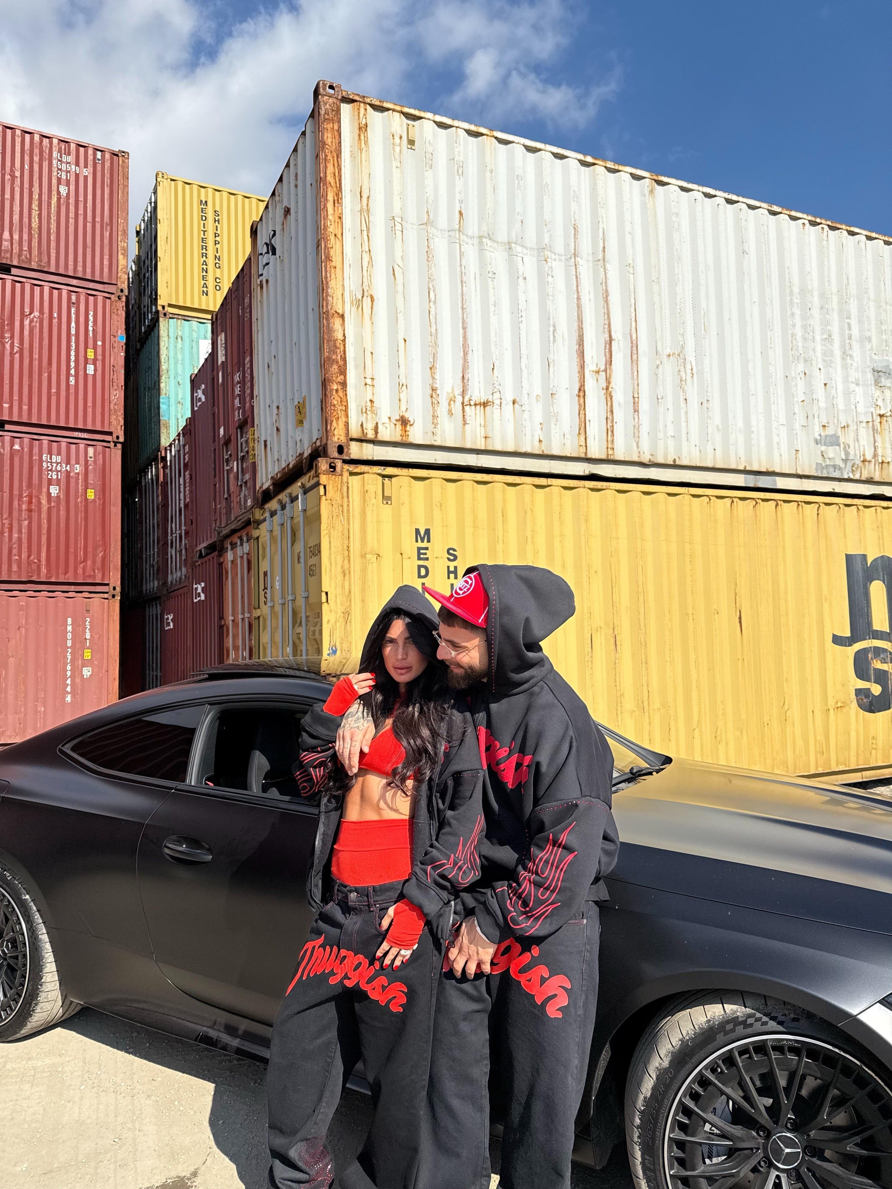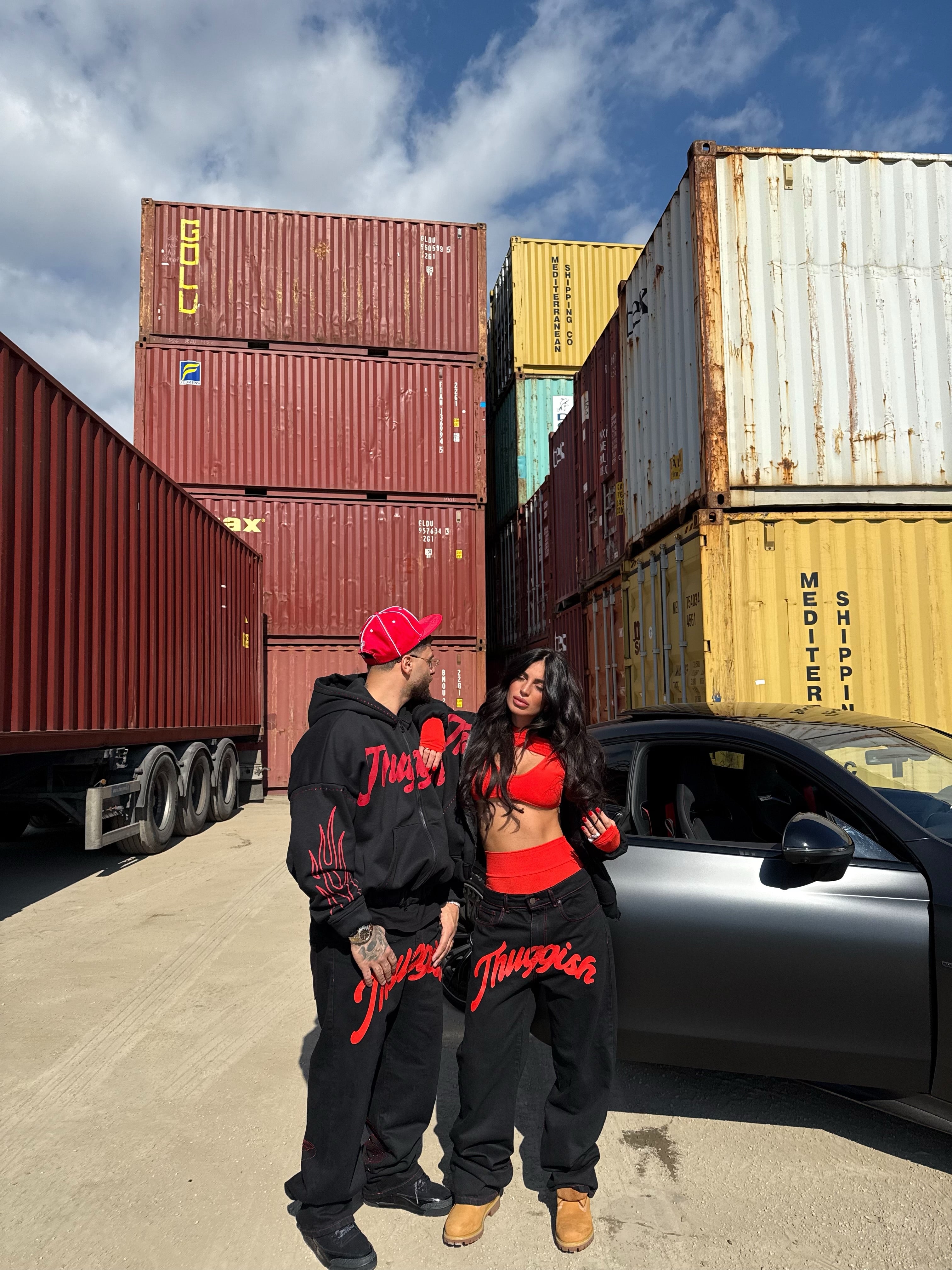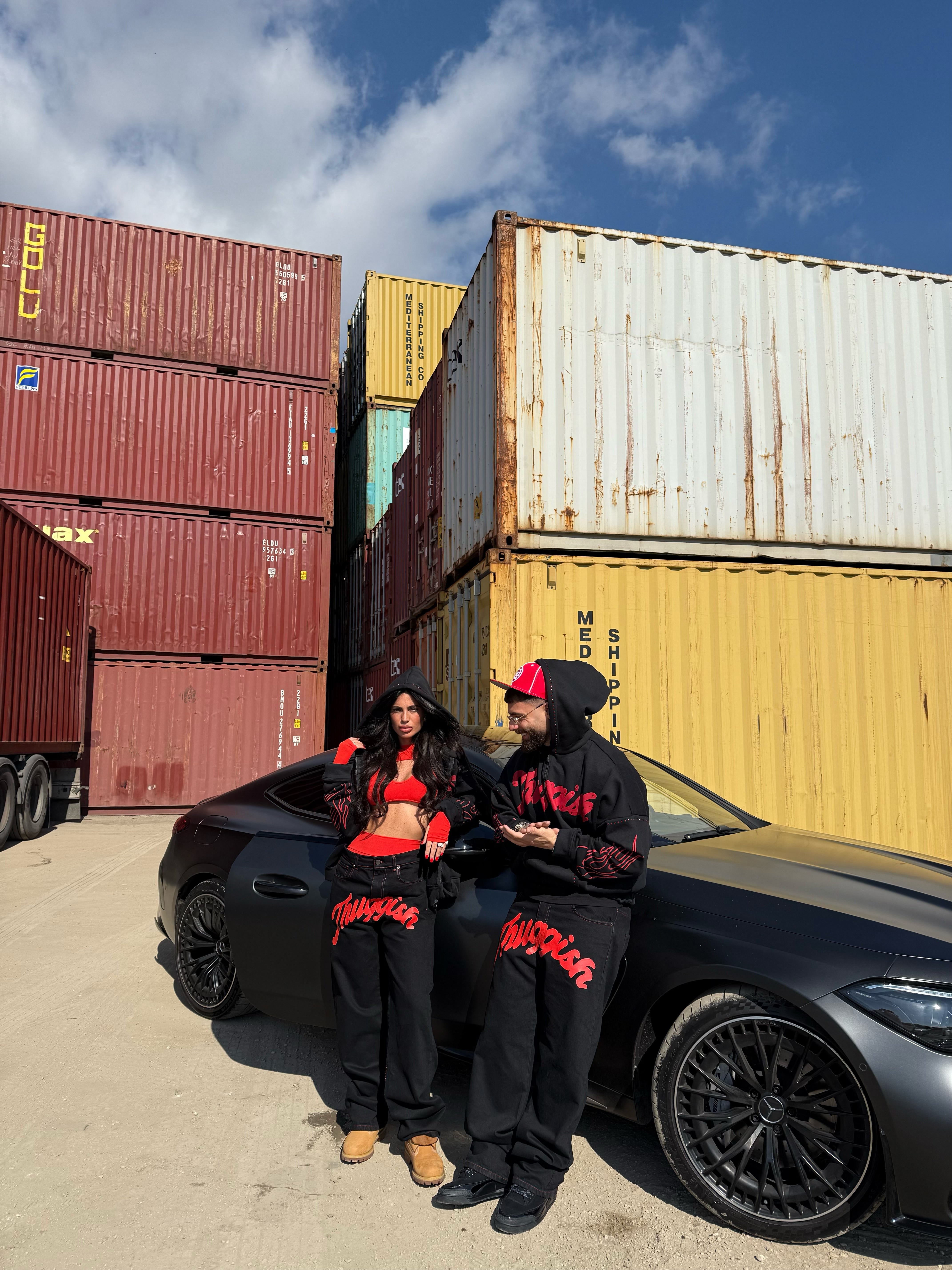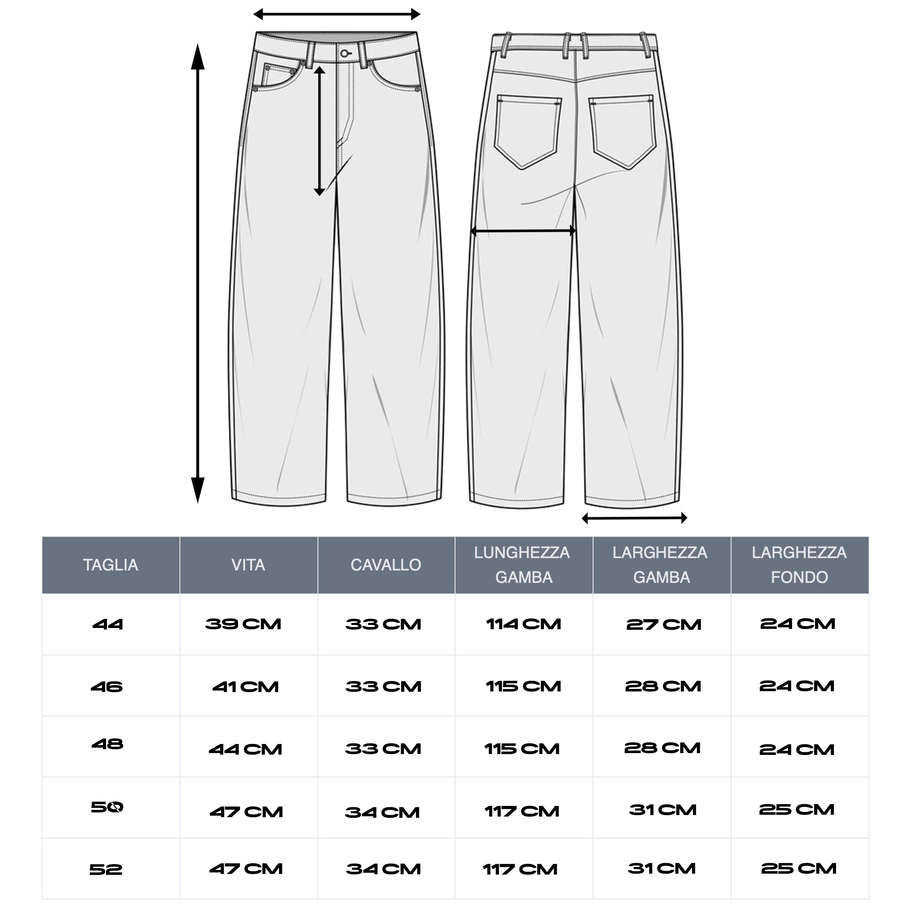 Jeans baggy con stampa frontale e decorazione sul fondo posteriore. Il modello é alto 178x90kg e indossa 52.